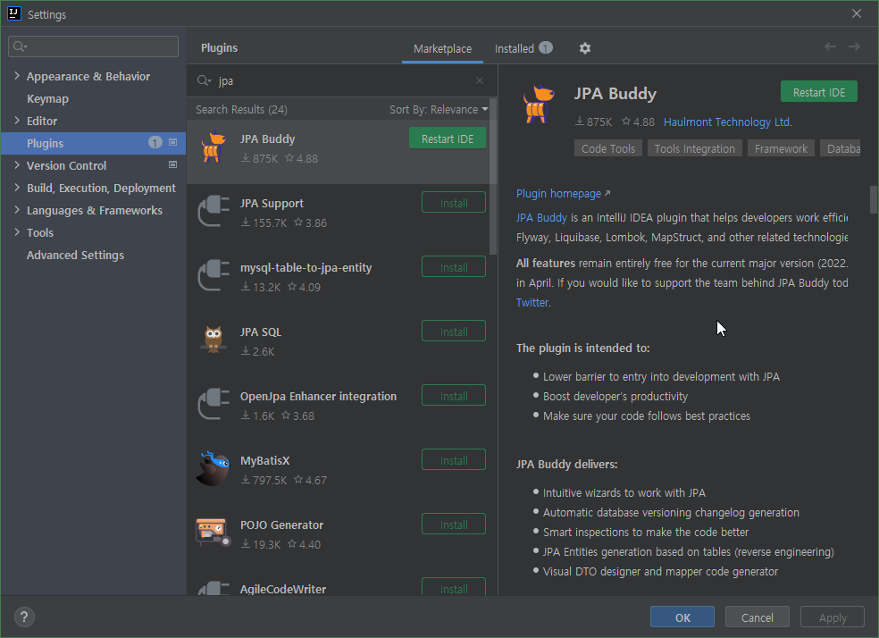 이후 jpa를 사용할 때 사용하기 좋은 플러그인을 하나 추가적으로 설치해주도록 하자.