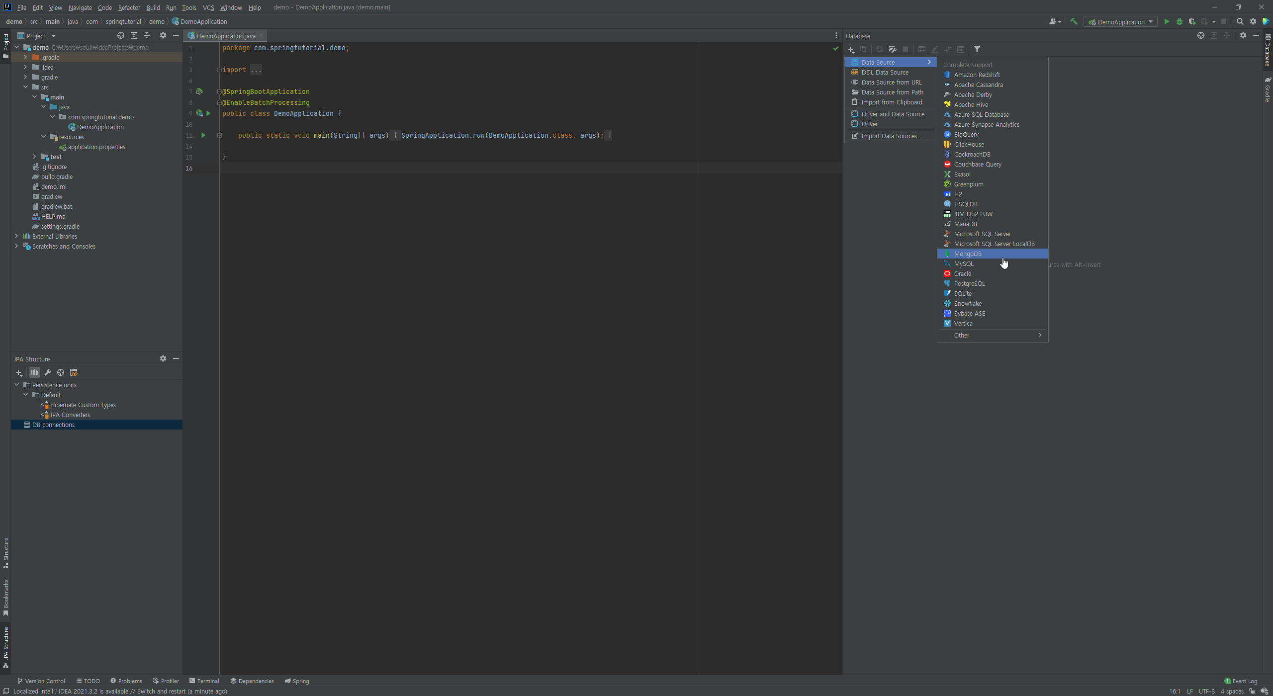 플러그인 설치 후, 인텔리제이를 재실행하면 우측에 다음과 같은 창에서 데이터베이스를 연결시켜주자.