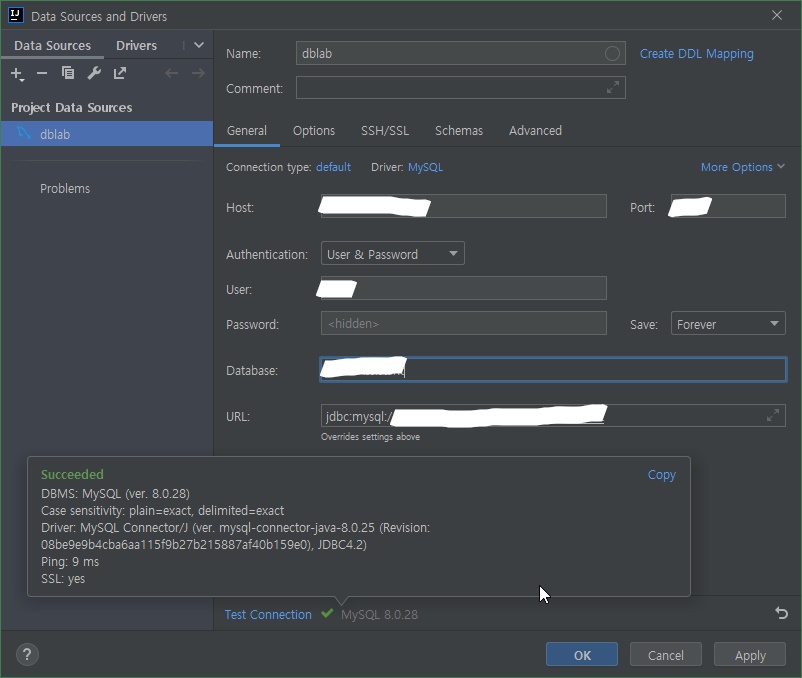 다음과 같이 필요한 데이터들을 입력시킨 후 테스트 커넥션을 누르면 연결 성공 시 다음과 같이 창이 뜰 것이다.