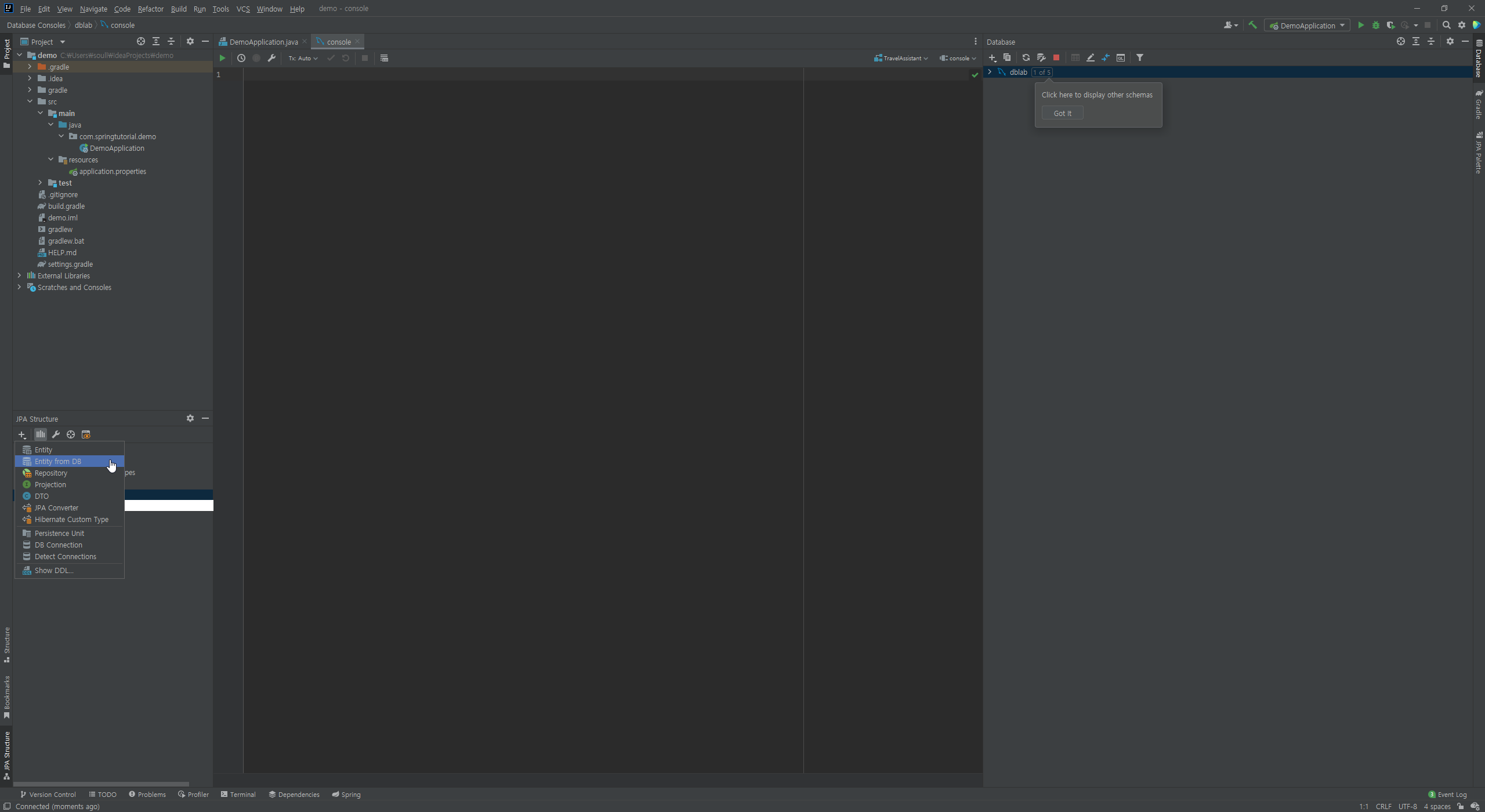 다음 좌측 jpa structure 탭에서 Entitiy from DB를 눌러, 테스트용으로 만들어놓은 테이블로 부터 엔티티를 생성하자.