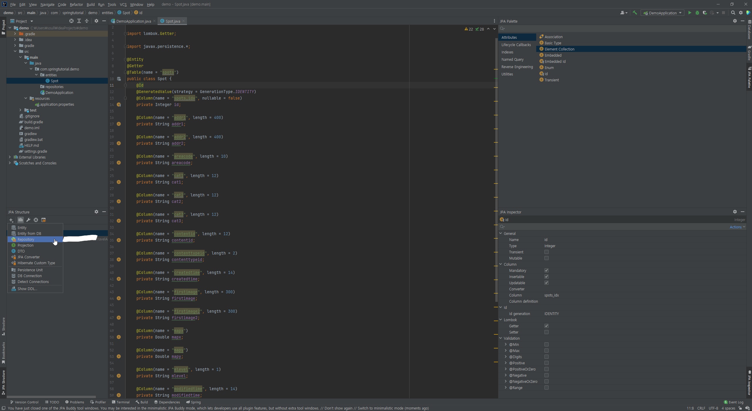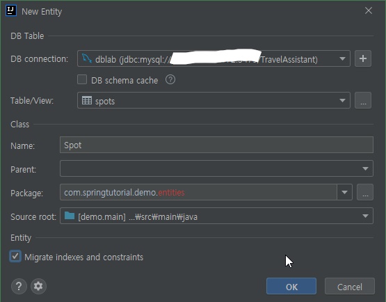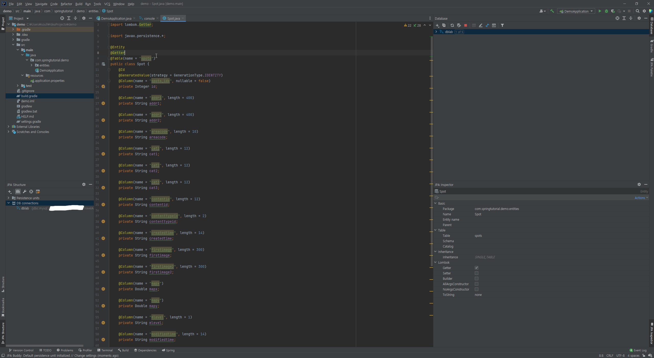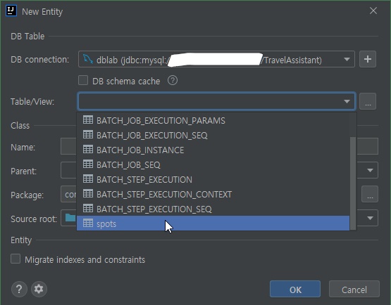 나의 경우 spots이라는 테이블을 미리 생성해 두었고, 이 테이블의 엔티티를 생성할 예정이다.
