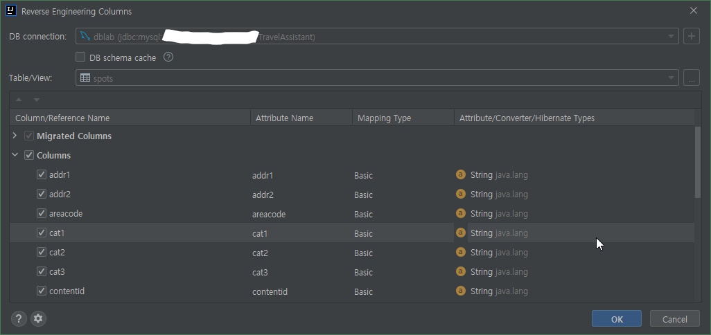 그러면 이렇게 해당 엔티티를 어떻게 설정할지, 엔티티의 아이템들의 형과 메핑 타입들을 설정하는 창이 나온다.