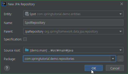 아까 만든 엔티티를 등록하고, 패키지를 repositories로 설정한 후 생성한다.