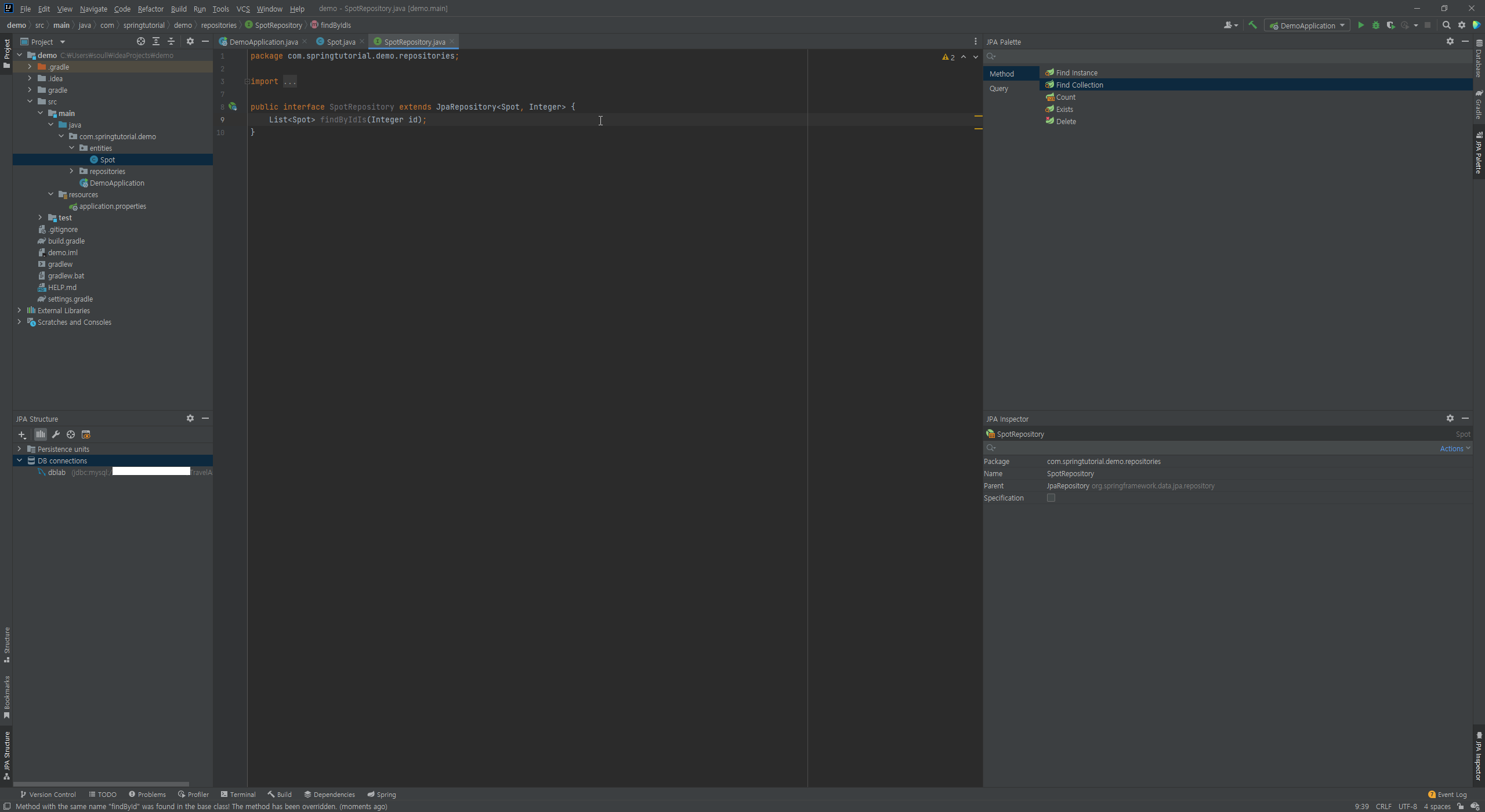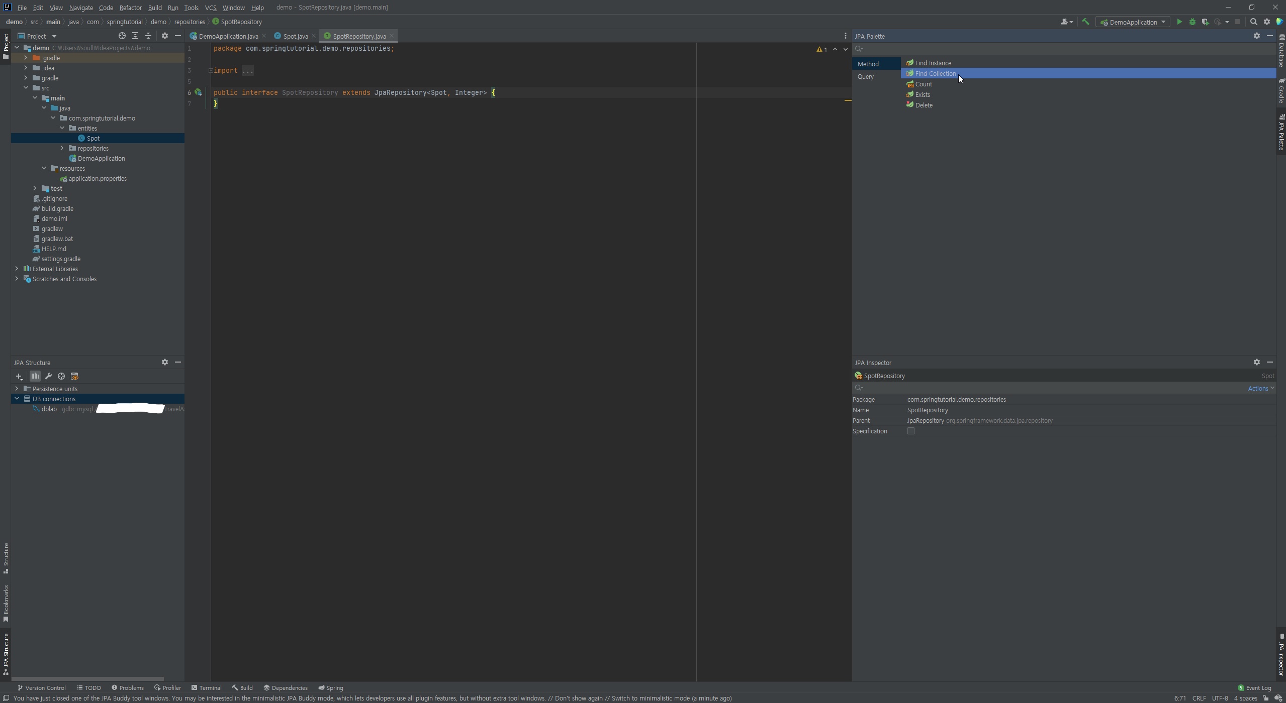 아까 깔았던 jpa buddy에서 지원하는 jpa palette에서 find collection을 드래그 앤 드랍으로 끌어다주면 메소드가 생성된다