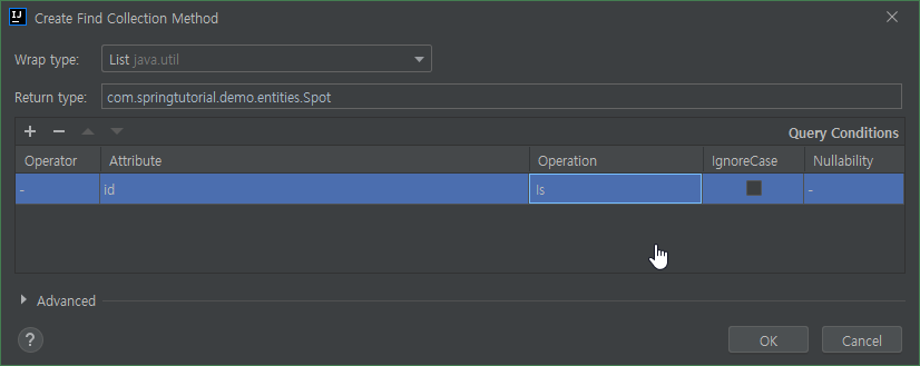 여기서는 id가 같은 컬럼을 가져오기 위한 조건으로, attribute가 id고 operation이 is인 경우에 찾아오도록 설정했다.