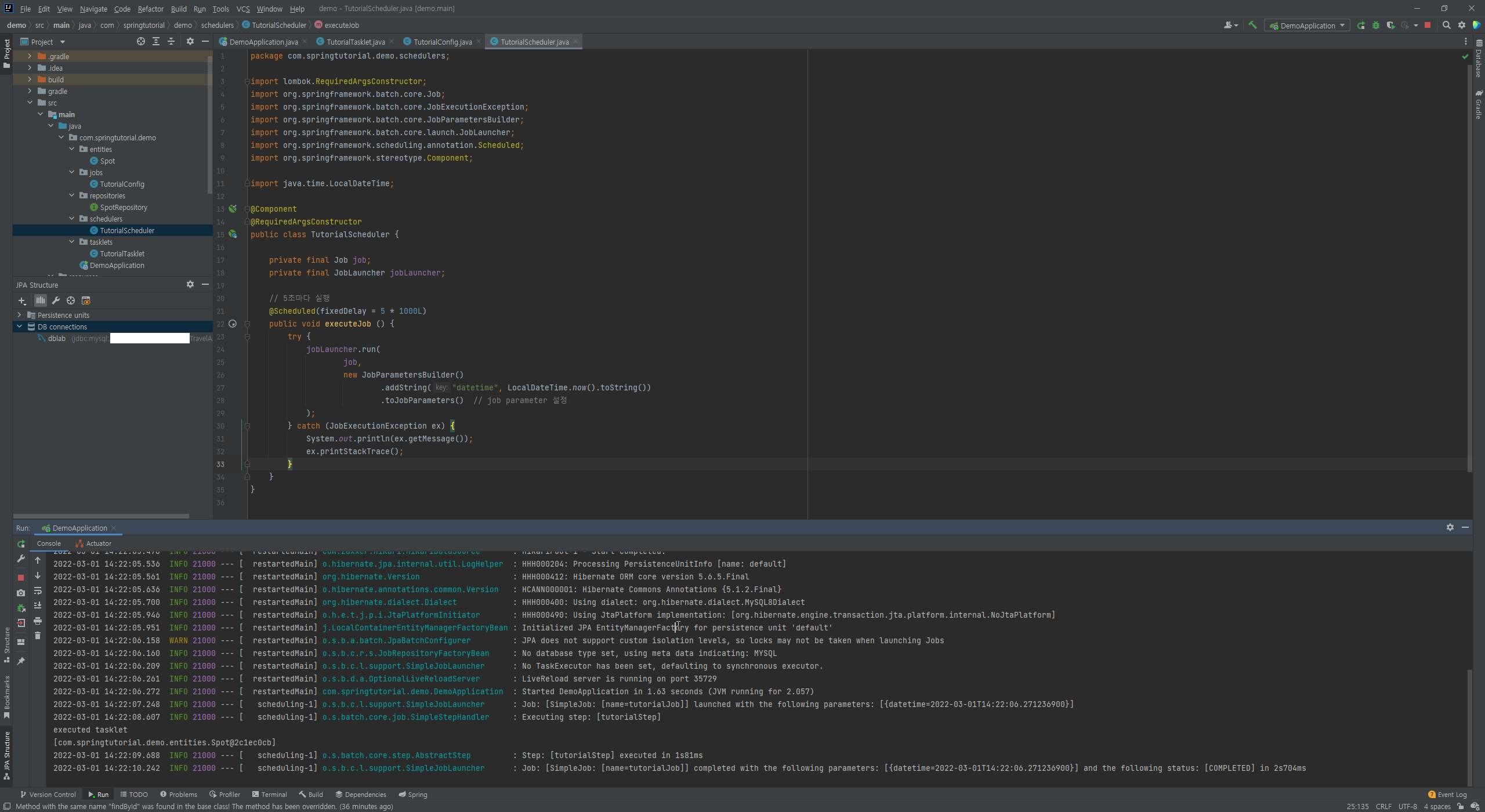 일단 잡과 스탭을 생성해준다. 그리고 step에서 사용되는 tasklet에 spotRepository가 사용되기때문에 new TutorialTasklet(spotRepository)로 생성해주었다