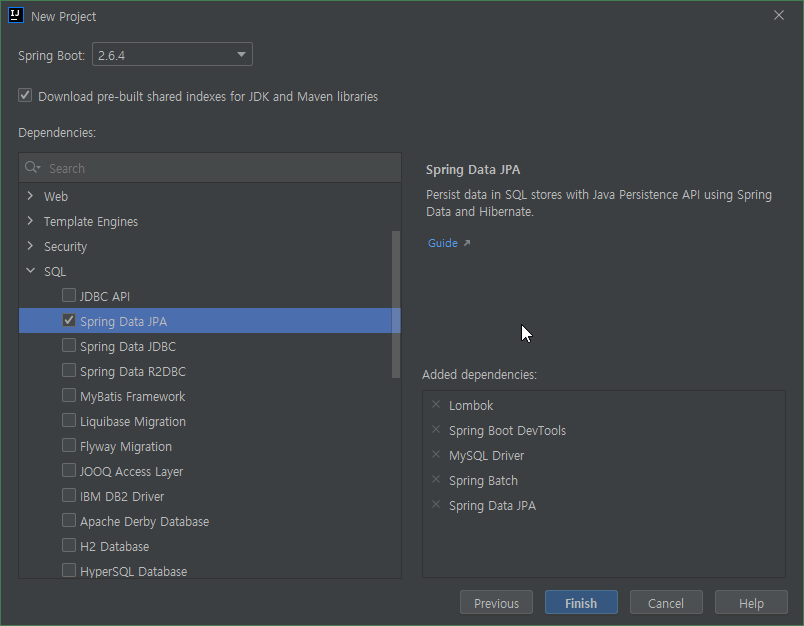 추가할 디팬던시는 Lombok, Spring Boot DevTools, Mysql Driver, Spring Batch, Spring Data JPA가 필요하다.